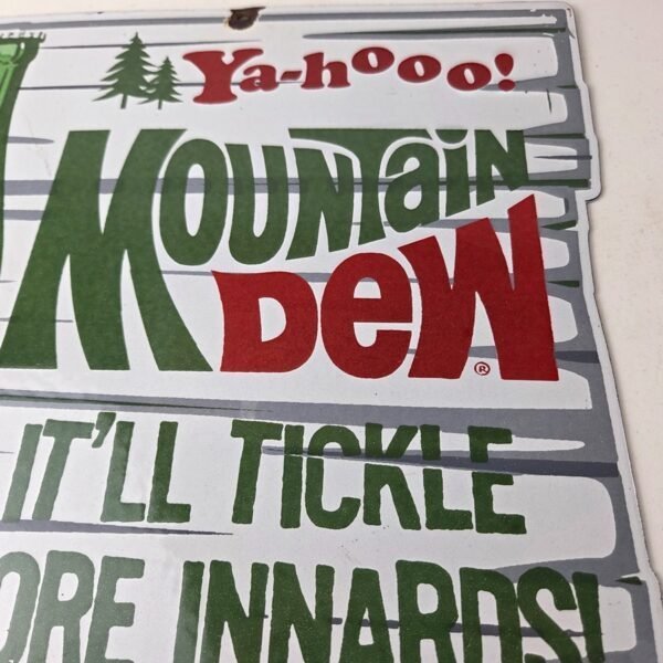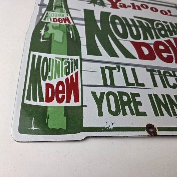 For sale is a vintage Mountain Dew soda porcelain Restaurant Diner sign.