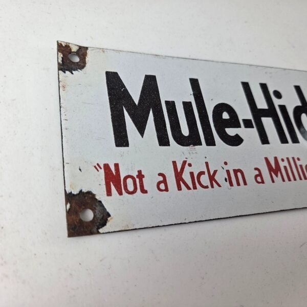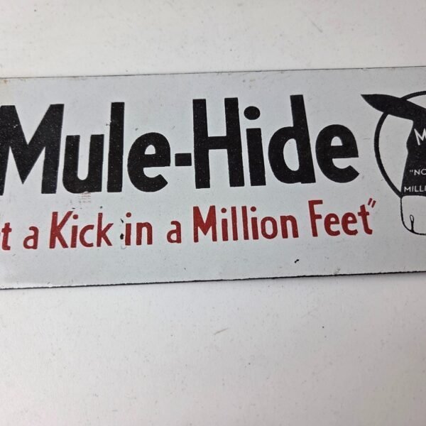 Measuring at 9 1/2″ x 3 1/2″, this sign is sure to catch the eye of anyone who enters your garage or shop. This sign features the iconic Mule-Hide graphic, making it a great addition to any vintage collection. The timeless design and durable porcelain construction make this sign a great piece that will add character and charm to any space like your man cave, collection, shop, or garage.