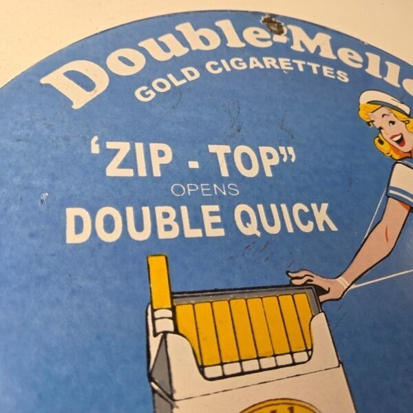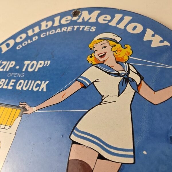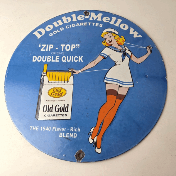 This vintage Double Mellow Old Gold Cigarette Porcelain sign features the pinup girl and is perfect for collectors of gas and tobacco advertising memorabilia. The sign measures 12″ and features a vibrant blue color scheme with bold lettering.