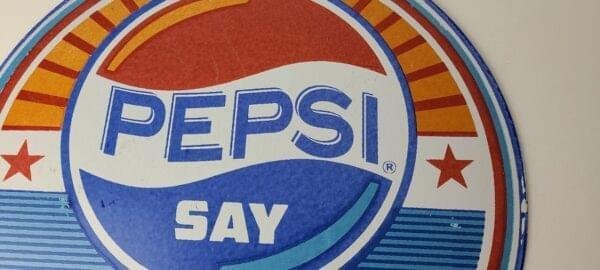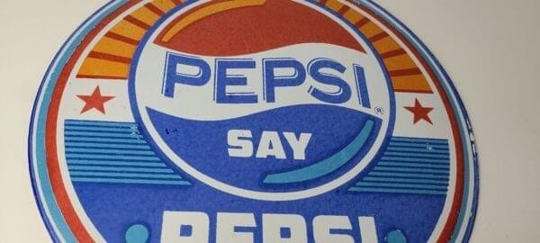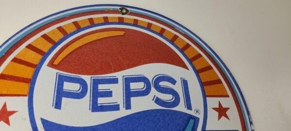 This vintage Pepsi Cola porcelain sign features the iconic Pepsi logo with large Pepsi lettering. It is made of porcelain and measures 12″ across.