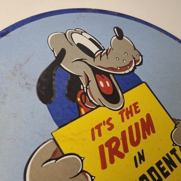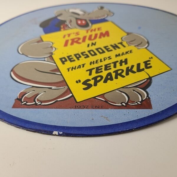 For sale is a vintage Pepsodent Teeth Sparkle porcelain sign featuring a playful Pluto design. This porcelain sign is perfect for adding a pop of color to any gas and oil themed collection. Measuring at a pump plate size of 12 inches, this sign is a great addition for any advertising or collectibles enthusiast.