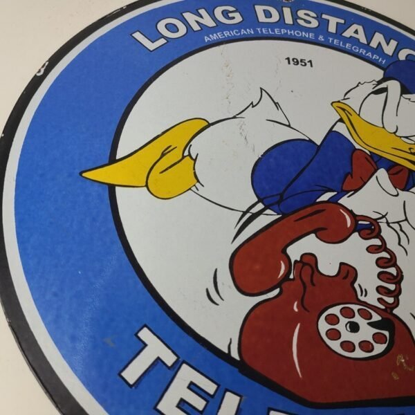 This vintage porcelain sign features striking colors with the words “Long Distance Telephone” and “American Telephone Telegraph” prominently displayed. Measuring at 12 inches in size, this sign is a great addition to any collection of gas and oil memorabilia. The sign is also ideal for those who enjoy vintage advertising and collectibles.