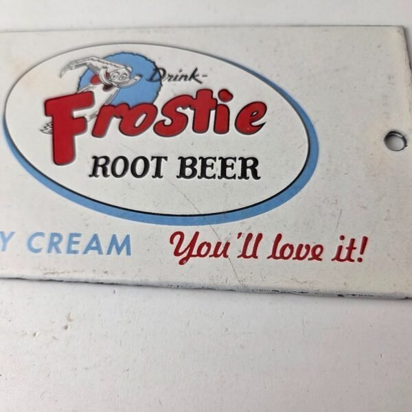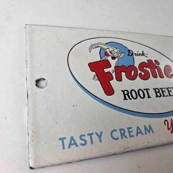 This vintage Frostie Root Beer porcelain sign features the iconic character with the Frostie logo graphic in the center. Add a vintage touch to your gas station or soda beverage collection with this Root Beer sign. Measuring 4″ x 7″ inches in size, this sign has excellent colors and porcelain.