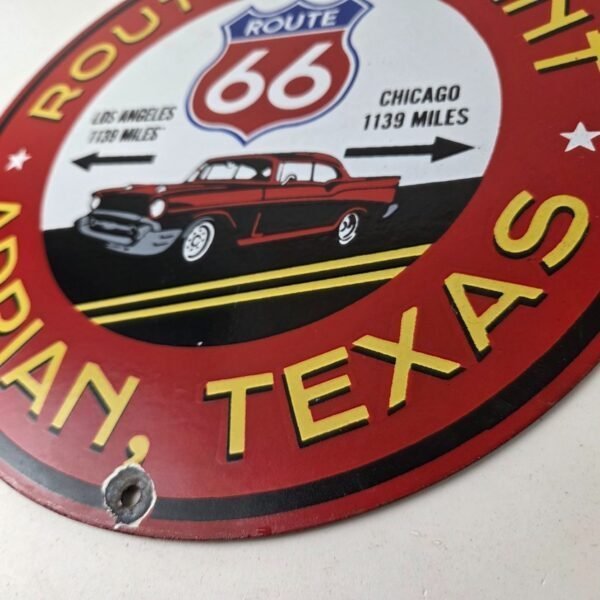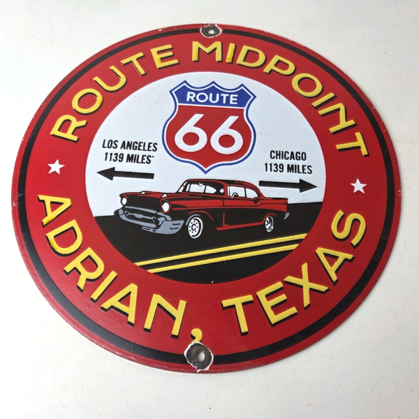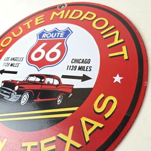 Vintage Route 66 Porcelain Sign – Texas Midpoint Gas Station Pump Road Ad Sign