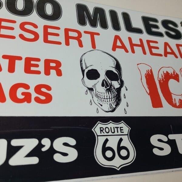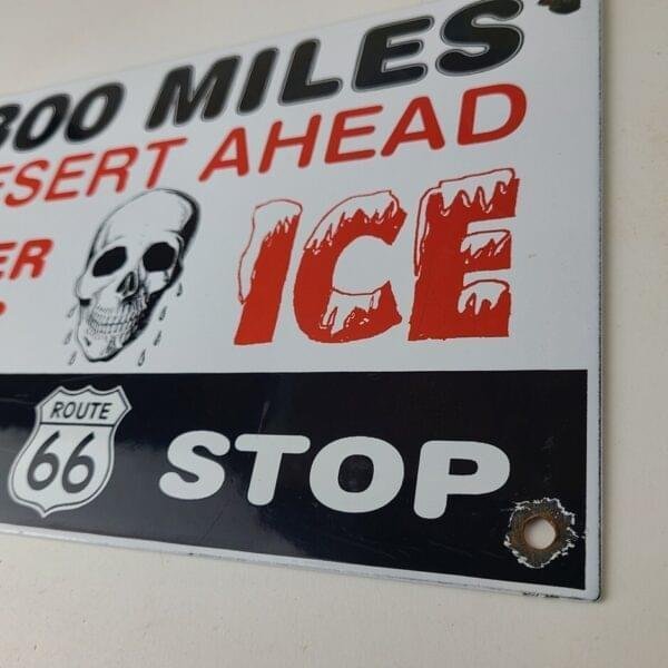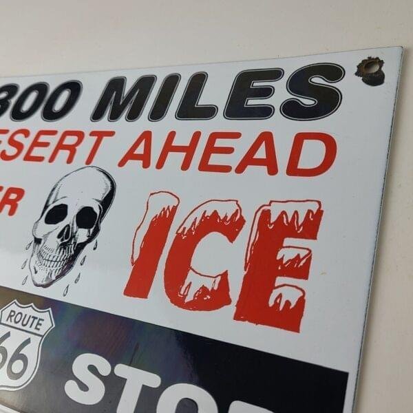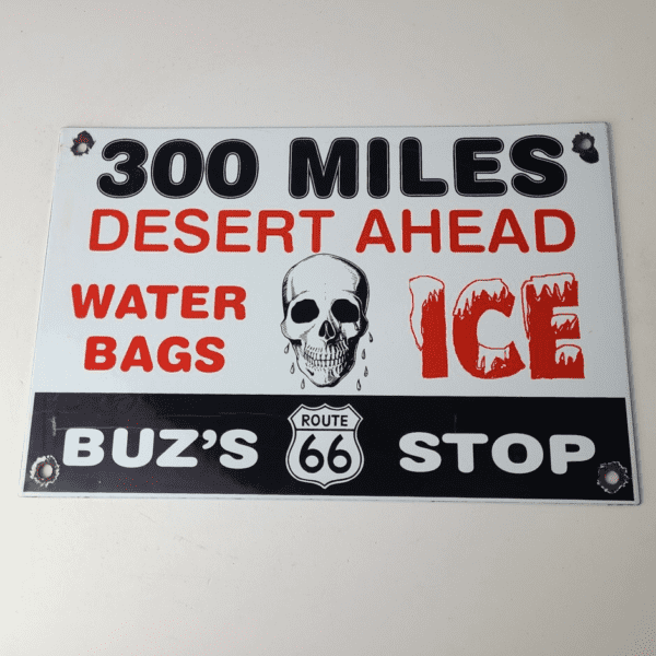 This vintage Gasoline Station porcelain sign features the iconic skull and Route 66 shield and is made of porcelain. The sign measures 12″ x 8″ across and features the Desert Ahead graphic with large lettering.
