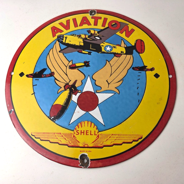 Vintage Shell Gasoline Sign – Military Navy War Bombs Gas Pump Porcelain Sign
