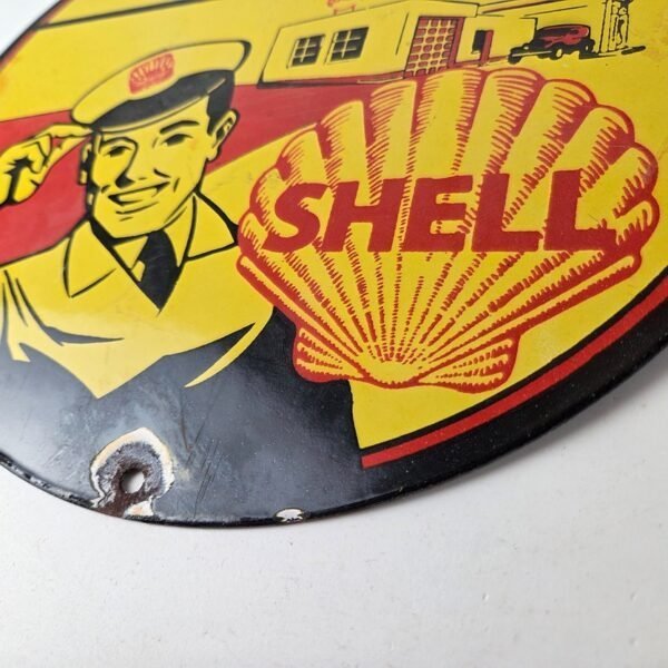 This vintage Shell Gasoline porcelain sign features the beloved Shell Gas Station attendant. Measuring 12 inches in size, this porcelain is in excellent condition with amazing gloss.