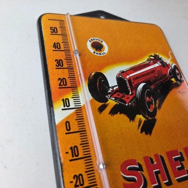 This vintage Shell thermometer is a must-have for any collector of gas and motor oil memorabilia. Made of durable porcelain, it features the iconic old racecar and is perfect for displaying in a garage or man cave. Measuring at 4 3/4 by 7 1/2 inches, it is a great size for display. With its bright colors and classic design this sign is sure to catch the eye of anyone who appreciates Gasoline advertising.