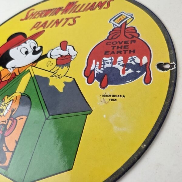 This vintage Sherwin Williams porcelain sign features the iconic Sherwin Williams brand, this porcelain sign showcases Mickey Mouse with a paint brush painting the dog shed. The yellow and red colors make the sign pop, perfect for adding to a gas and oil or advertising collection.