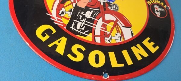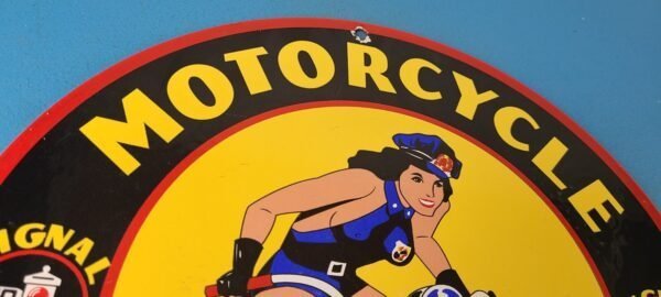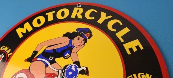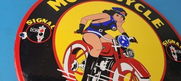 This vintage Signal Gasoline porcelain sign features the iconic Harley Davidson Motorcycles police pinup girl, making it a must-have for any motorcycle enthusiast. The sign is made of porcelain and has the pinup girl biker on a Harley Davidson.