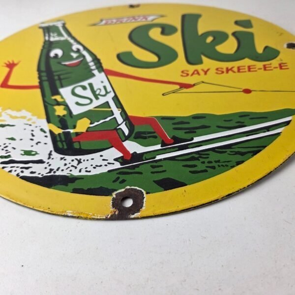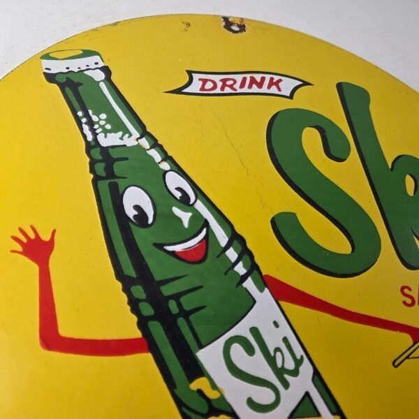 It is a vintage Ski Citrus soda porcelain sign featuring the iconic Ski glass soda bottle water skiing. If you love retro gas and oil memorabilia, or the classic soda signs, you will appreciate this sign. It measures 12 inches in diameter and is in excellent condition.