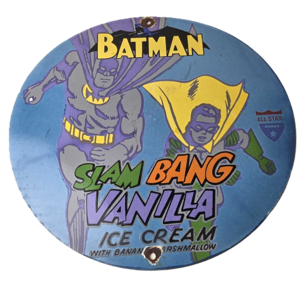 This vintage Slam Bang Vanilla Ice Cream porcelain sign features the iconic Batman and Robin, advertising for Vanilla Ice Cream. Add a vintage touch to your gas station or soda beverage collection with this Slam Bang Vanilla sign. Measuring 12 inches in size, this sign has excellent colors and porcelain.