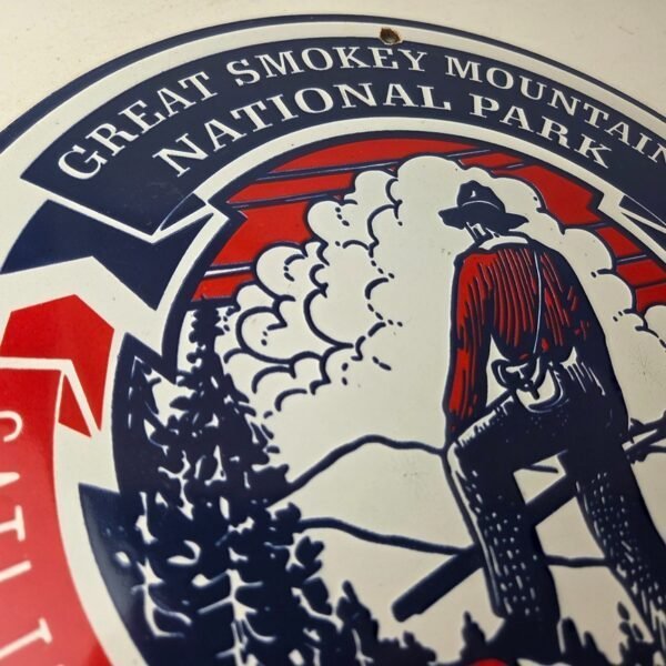 This vintage Great Smokey Mountains National Park porcelain sign features really nice graphic of the goat with large Smokey Mountain lettering at the top. This sign is made of porcelain and measures 12″ across.