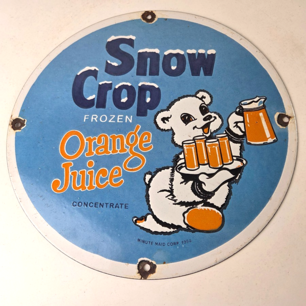 This vintage Snow Crop Frozen Orange Juice porcelain sign features the iconic bear with the Polar Bear beverage theme. Add a vintage touch to your gas station or soda beverage collection with this Snow Crop sign. Measuring 12 inches in size, this sign has excellent colors and porcelain.