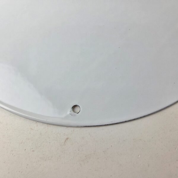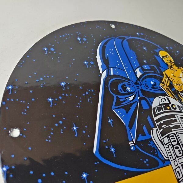 This vintage Star Wars porcelain sign features the iconic villain, Darth Vader. The sign showcases a bold yellow, blue, and black color scheme with the Star Wars brand name prominently displayed. This piece of advertising is sure to please any fan of the classic movie franchise and adds a touch of nostalgia to any space. Made in the United States, this sign is a must-have and measures 11 3/4″ across.