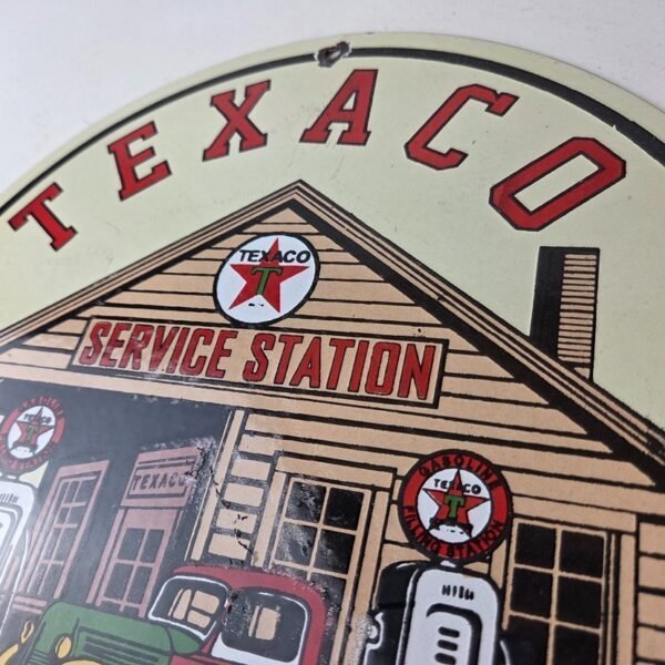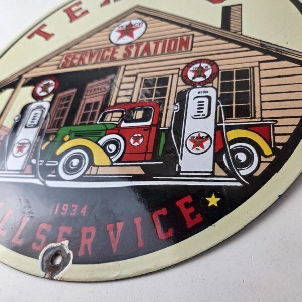 This vintage Texaco 1934 service station sign makes a great addition to a garage, shop display, man cave, or any Texaco memorabilia collection, vintage gas station advertising collection, or petroliana collection.