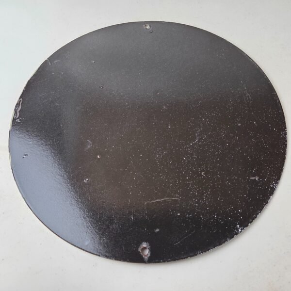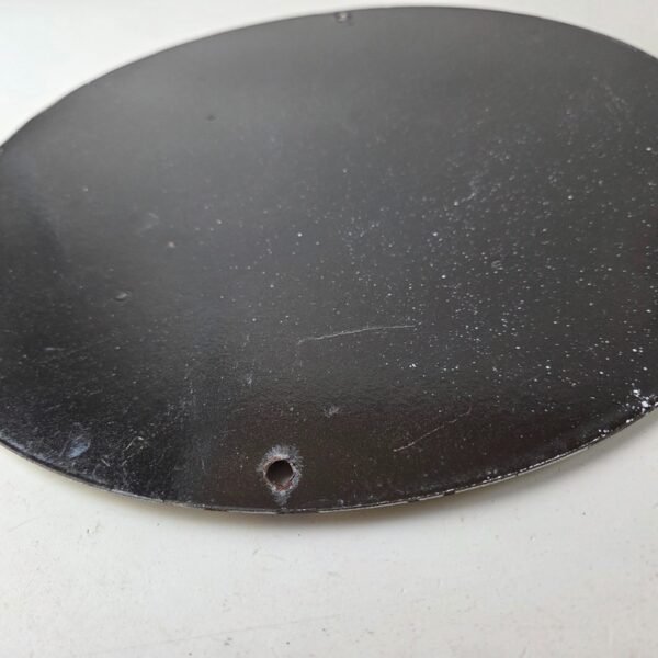 Made of porcelain enamel on steel with patina and wear: rust spotting around the mounting holes, minor edge chips, light surface scratches, and minimal discoloration. This is a porcelain enamel advertising sign in excellent condition, exactly as shown in the photos.