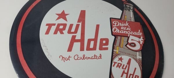 Add a vintage touch to your bar, man cave or soda collection with this stunning porcelain sign featuring the iconic Tru Ade advertising. Measures 12″ across. The vibrant color and gas & oil theme make it a perfect addition to any vintage advertisement collection.